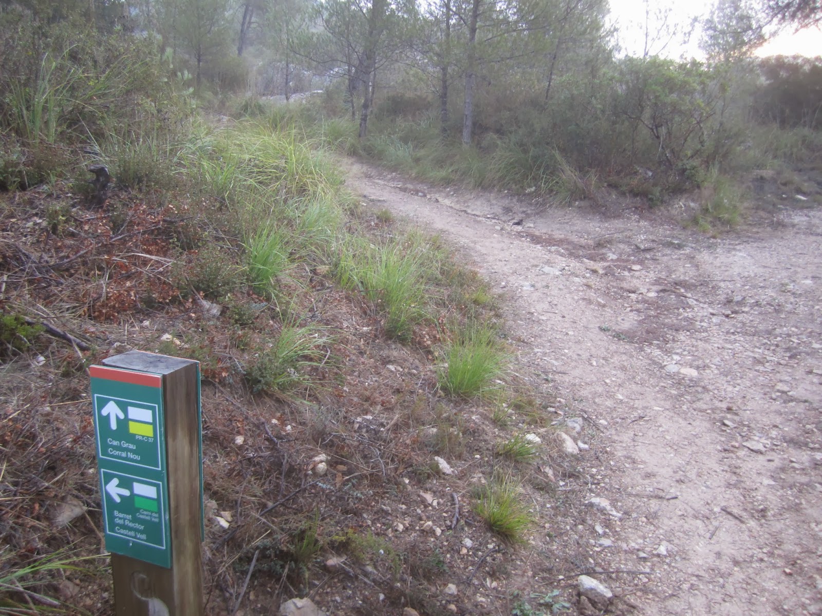 Un cop vista, torneu enrere, i al baixar de la quadra, aneu recte, entre vinyes. Passades les vinyes heu d'agafar un corriol a mà dreta, que s'enfila de valent, per metres més amunt sortir a una pista, continueu a la dreta fins arribar a un trencall de camins. Aquí heu de seguir el corriol del davant, marcat coma GR 92.3. Més avall sortiu a una pista, seguiu les marques de GR i aneu de cara avall. Aneu seguint aquesta ample pista que ressegueix el Fondo dels Massets d'en Ferrer, fins que trobeu un trencall, aquí heu d'anar recte, i deixar el GR, que se'n va per la pista de la dreta.